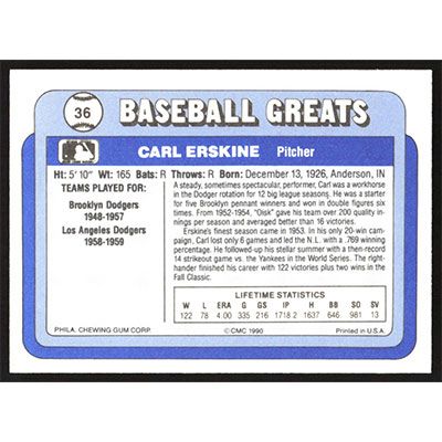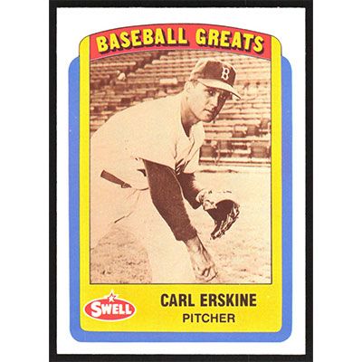 This is a 1990 Swell Baseball Greats Carl Erskine baseball card. The card is #36 and pictures show condition.