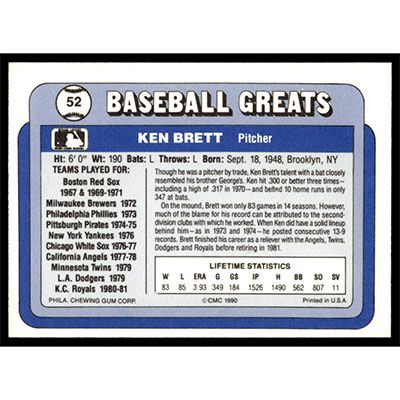 This is a 1990 Swell Baseball Greats Ken Brett baseball card. The card is #52 and pictures show condition.