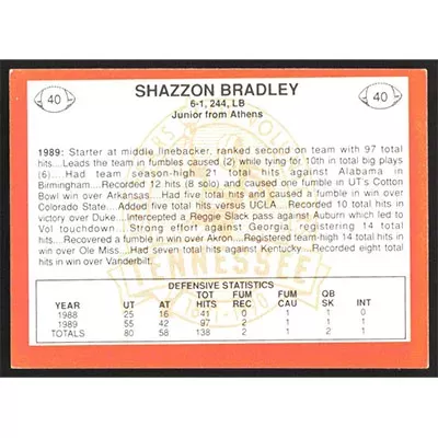 This is a 1990 Tennessee Volunteers Centennial Shazzon Bradley football card. The card is #40 and pictures show condition.