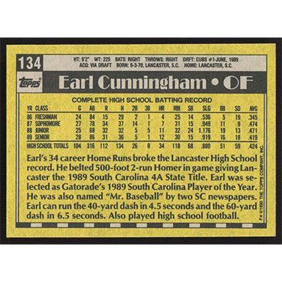 This is a 1990 Topps Earl Cunningham #1 Draft Pick baseball card. The card is #134 and pictures show condition. Team(s): Chicago Cubs Rookie Card (RC)