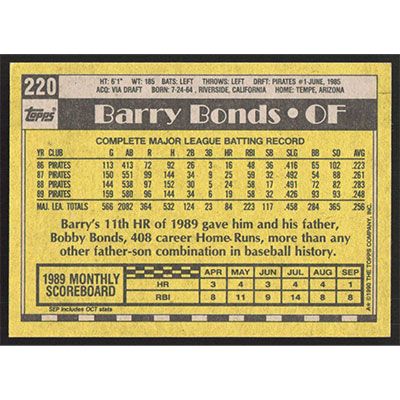 This is a 1990 Topps Barry Bonds baseball card. The card is #220 and pictures show condition.
