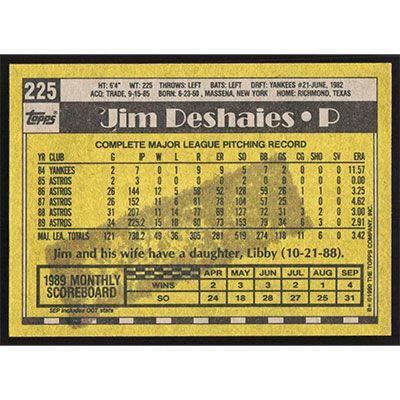 This is a 1990 Topps Jim Deshaies baseball card. The card is #225 and pictures show condition.