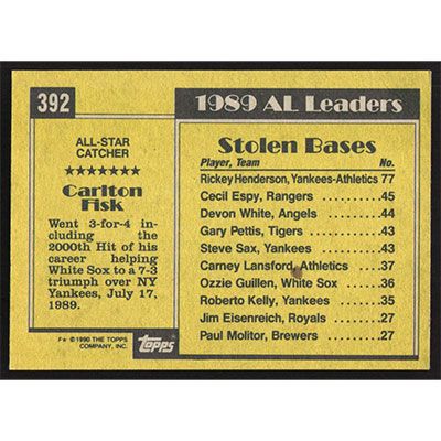 This is a 1990 Topps Carlton Fisk All-Star baseball card. The card is #392 and pictures show condition.