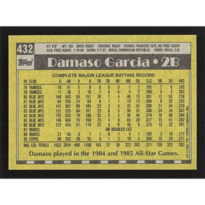 This is a 1990 Topps Damaso Garcia baseball card. The card is #432 and pictures show condition.