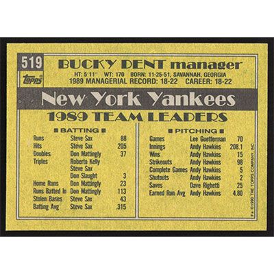This is a 1990 Topps Bucky Dent baseball card. The card is #519 and pictures show condition.