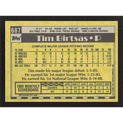 This is a 1990 Topps Tim Birtsas baseball card. The card is #687 and pictures show condition.