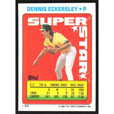This is a 1990 Topps Stickers Dennis Eckersley, John Kruk and Dan Pasqua Super Star Backs baseball card. The card is #64/117/306 and pictures show condition.