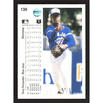 This is a 1990 Upper Deck Tony Fernandez baseball card. The card is #130 and pictures show condition.