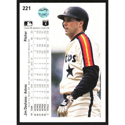 This is a 1990 Upper Deck Jim Deshaies baseball card. The card is #221 and pictures show condition.