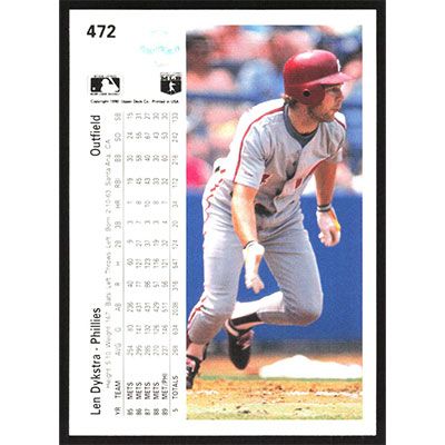 This is a 1990 Upper Deck Len Dykstra baseball card. The card is #472 and pictures show condition.