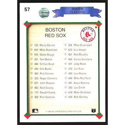 This is a 1990 Upper Deck Roger Clemens Team Checklist baseball card. The card is #57 and pictures show condition.