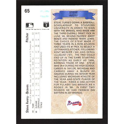 This is a 1990 Upper Deck Steve Avery Star Rookie autographed baseball card. This card has been signed, in blue, by Steve Avery, and is guaranteed authentic by Ballcardz.com. The card is #65 and pictures show condition.