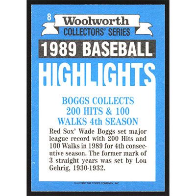 This is a 1990 Woolworth's Topps Wade Boggs baseball card. The card is #8 and pictures show condition.