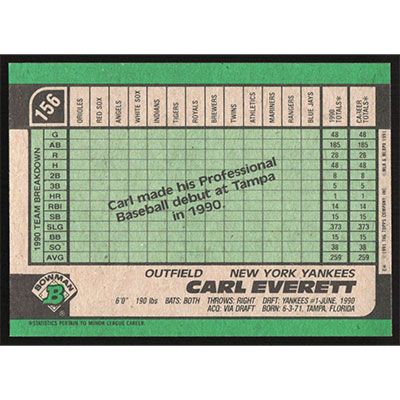 This is a 1991 Bowman Carl Everett baseball card. The card is #156 and pictures show condition.