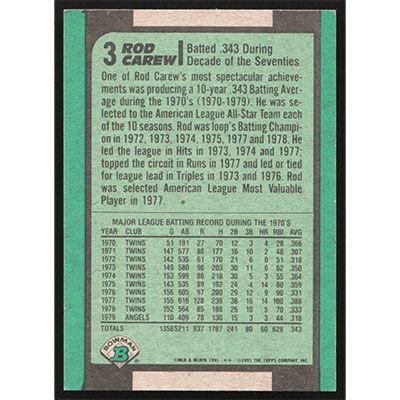 This is a 1991 Bowman Rod Carew III baseball card. The card is #3 and pictures show condition.