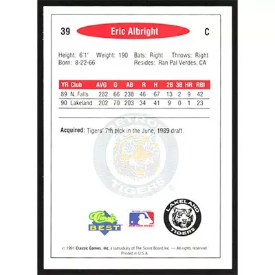 This is a 1991 Classic Best Eric Albright baseball card. The card is #39 and pictures show condition.