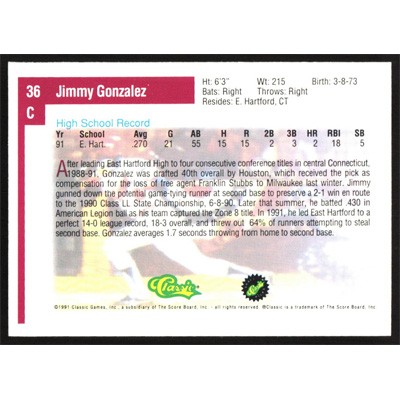 This is a 1991 Classic Draft Picks Jimmy Gonzalez baseball card. The card is #36 and pictures show condition.