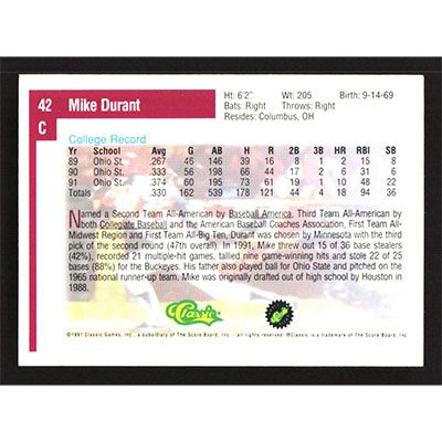 This is a 1991 Classic Draft Picks Mike Durant baseball card. The card is #42 and pictures show condition.