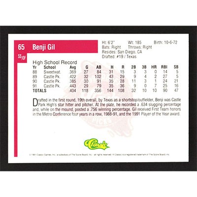 This is a 1991 Classic Four Sport Benji Gil baseball card. The card is #65 and pictures show condition.