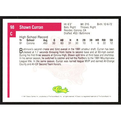 This is a 1991 Classic Four Sport Shawn Curran baseball card. The card is #98 and pictures show condition.