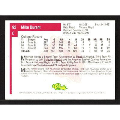 This is a 1991 Classic Four Sport French Mike Durant baseball card. The card is #92 and pictures show condition.