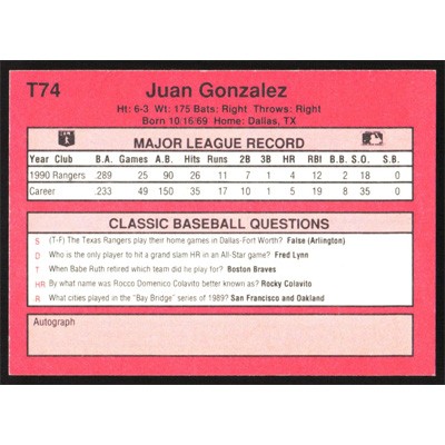 This is a 1991 Classic II Juan Gonzalez baseball card. The card is #T74 and pictures show condition.