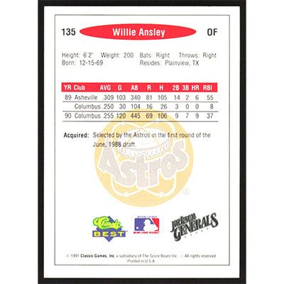 This is a 1991 Classic/Best Willie Ansley baseball card. The card is #135 and pictures show condition.