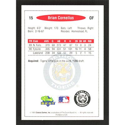 This is a 1991 Classic/Best Brian Cornelius baseball card. The card is #15 and pictures show condition.