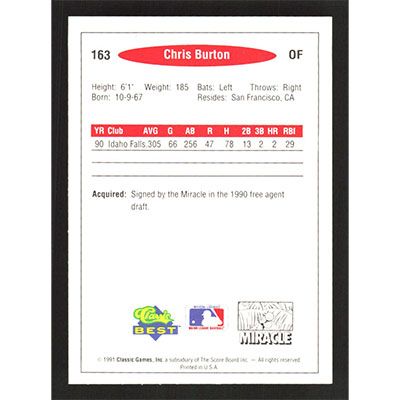 This is a 1991 Classic/Best Chris Burton baseball card. The card is #163 and pictures show condition.