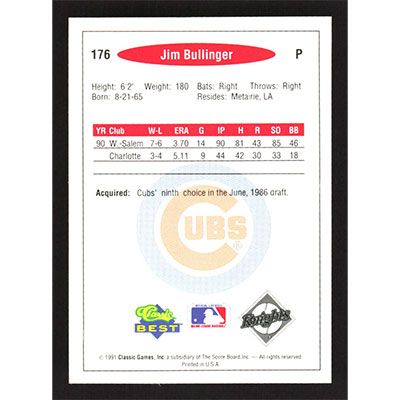 This is a 1991 Classic/Best Jim Bullinger baseball card. The card is #176 and pictures show condition.