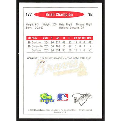 This is a 1991 Classic/Best Brian Champion baseball card. The card is #177 and pictures show condition.