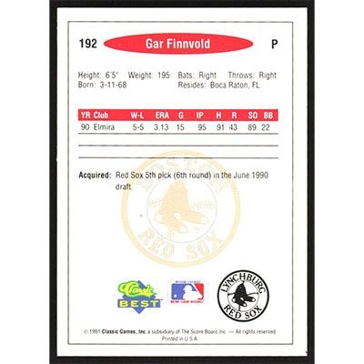 This is a 1991 Classic/Best Gar Finnvold baseball card. The card is #192 and pictures show condition.