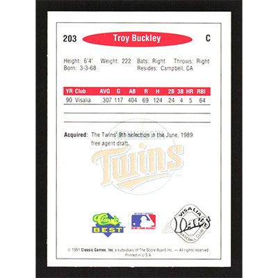 This is a 1991 Classic/Best Troy Buckley baseball card. The card is #203 and pictures show condition.