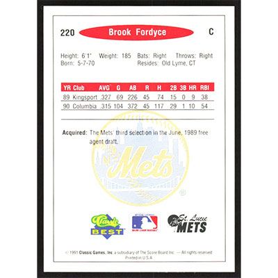This is a 1991 Classic/Best Brook Fordyce baseball card. The card is #220 and pictures show condition.