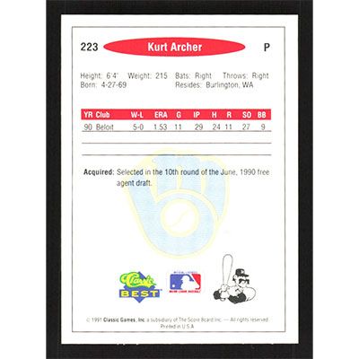 This is a 1991 Classic/Best Kurt Archer baseball card. The card is #223 and pictures show condition.