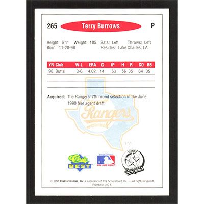 This is a 1991 Classic/Best Terry Burrows baseball card. The card is #265 and pictures show condition.