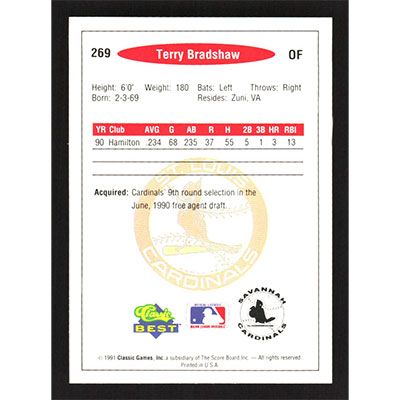 This is a 1991 Classic/Best Terry Bradshaw baseball card. The card is #269 and pictures show condition.