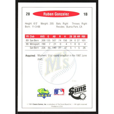 This is a 1991 Classic/Best Ruben Gonzalez baseball card. The card is #28 and pictures show condition.