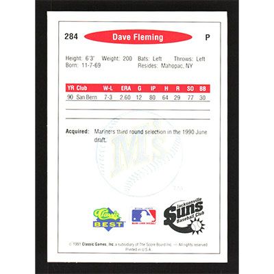 This is a 1991 Classic/Best Dave Fleming baseball card. The card is #284 and pictures show condition.