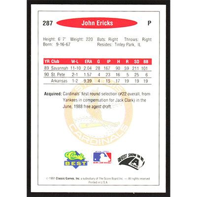 This is a 1991 Classic/Best John Ericks baseball card. The card is #287 and pictures show condition.