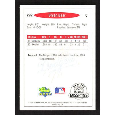 This is a 1991 Classic/Best Bryan Baar baseball card. The card is #292 and pictures show condition.