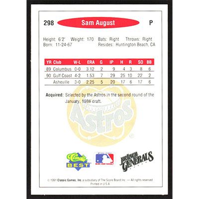 This is a 1991 Classic/Best Sam August baseball card. The card is #298 and pictures show condition.