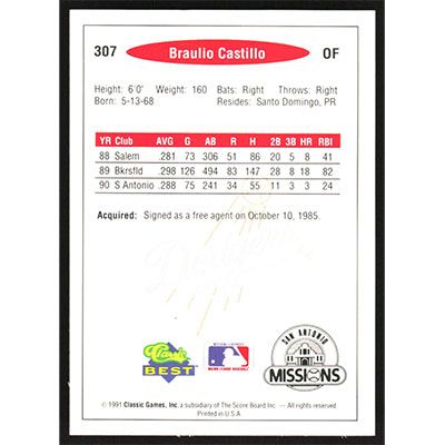 This is a 1991 Classic/Best Braulio Castillo baseball card. The card is #307 and pictures show condition.