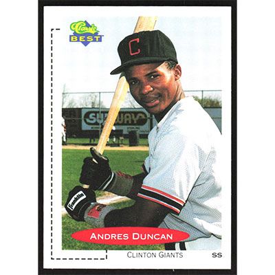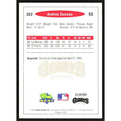 This is a 1991 Classic/Best Andres Duncan baseball card. The card is #322 and pictures show condition.