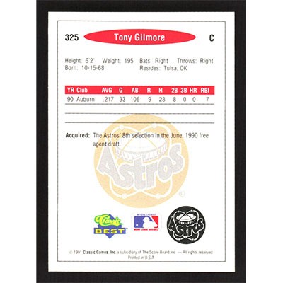 This is a 1991 Classic/Best Tony Gilmore baseball card. The card is #325 and pictures show condition.