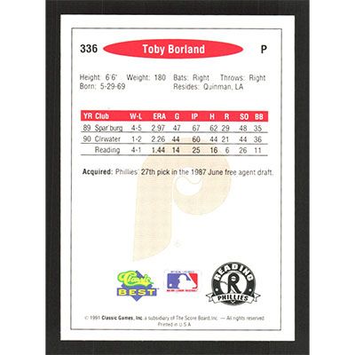 This is a 1991 Classic/Best Toby Borland baseball card. The card is #336 and pictures show condition.