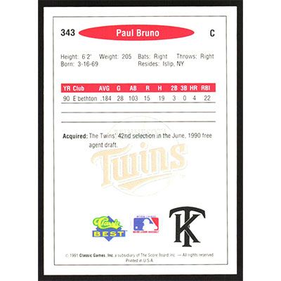 This is a 1991 Classic/Best Paul Bruno baseball card. The card is #343 and pictures show condition.