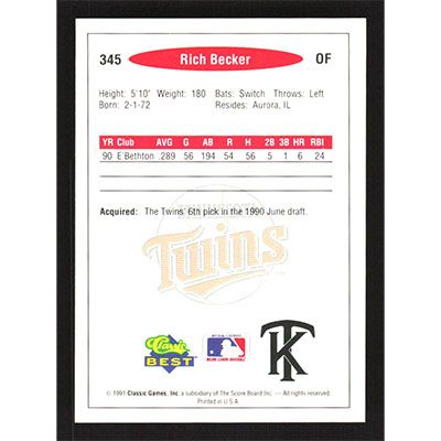 This is a 1991 Classic/Best Rich Becker baseball card. The card is #345 and pictures show condition.