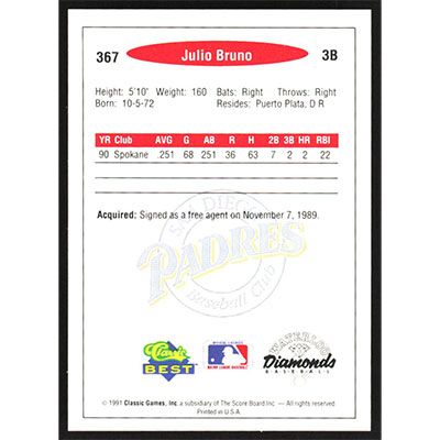 This is a 1991 Classic/Best Julio Bruno baseball card. The card is #367 and pictures show condition.