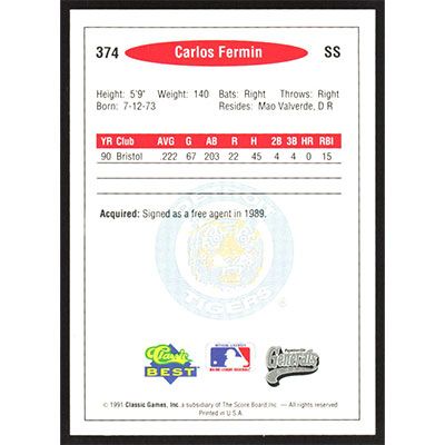 This is a 1991 Classic/Best Carlos Fermin baseball card. The card is #374 and pictures show condition.